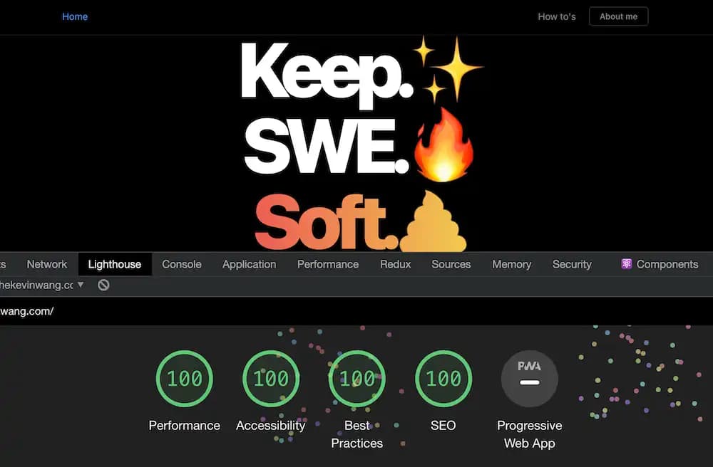 And for fun, here's a shot of the in-browser lighthouse score. (Although https://web.dev/measure/ is a more accurate assessment.)