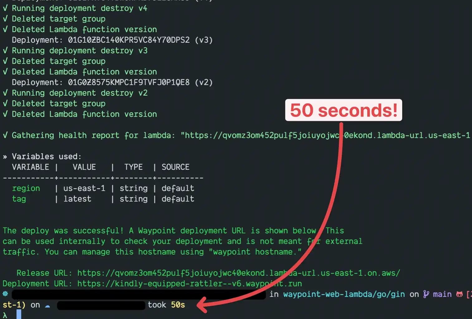 changes will be deployed.In the following terminal screenshot, you can see that Waypoint finished in 50 seconds. This example was using the Golang project, for which the Docker image builds quite fast on my M1 Macbook Pro. The Swift and Rust Docker images take significantly longer.