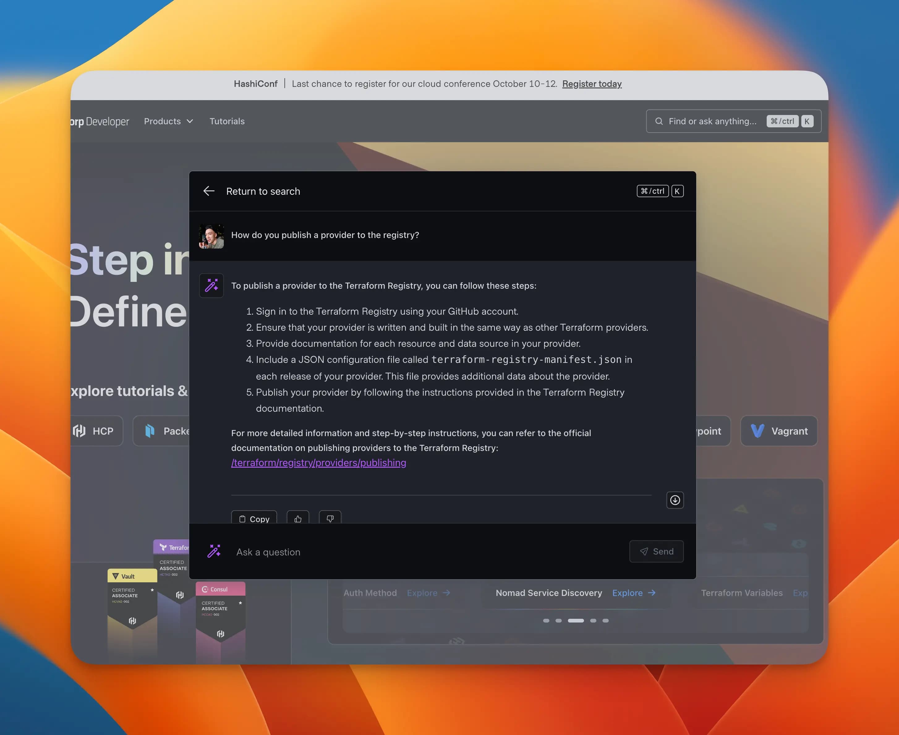 Yesterday, October 4, 2023, was my last day at HashiCorp after a great two year run on the awesome Web Presence team. Prior to my departure, I shipped “Developer AI” as a closed beta. This is an LLM-powered Q&A interface with retrieval augmented generation (RAG).