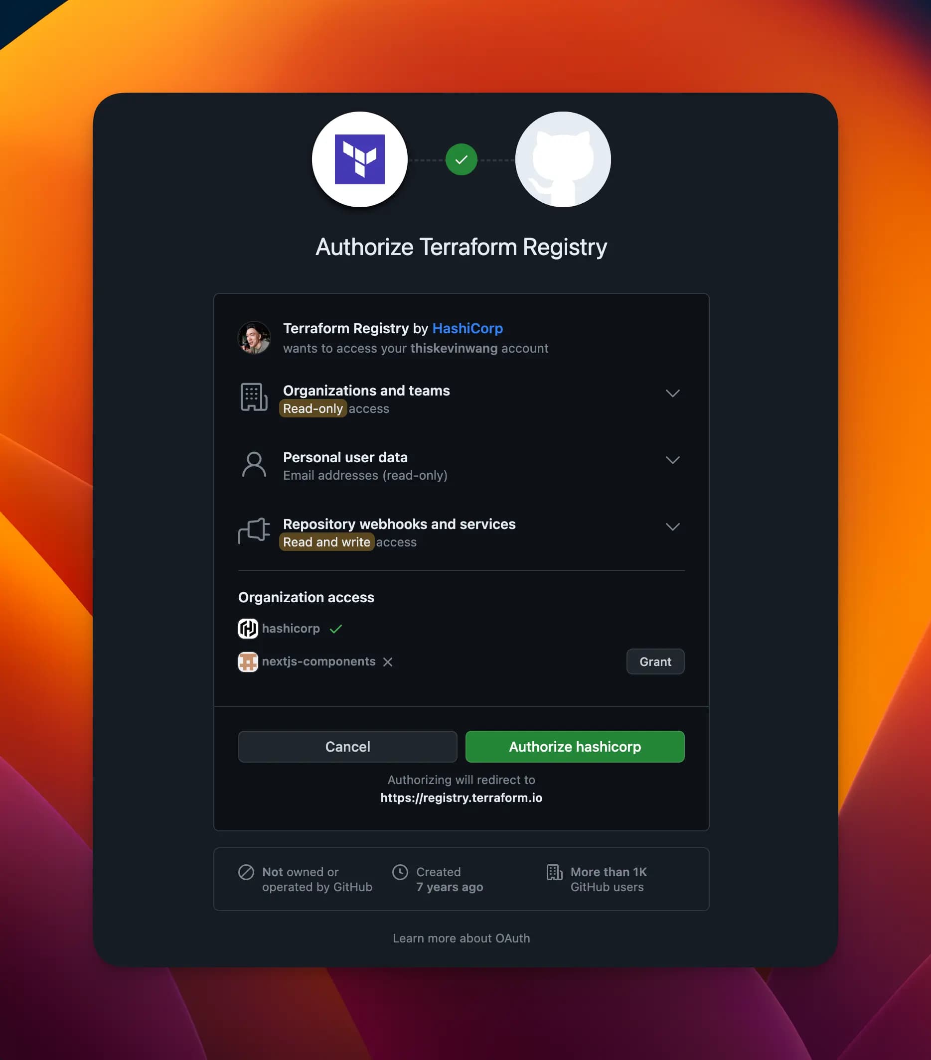 Sign in to the Terraform Registry and authorize the GitHub app.
