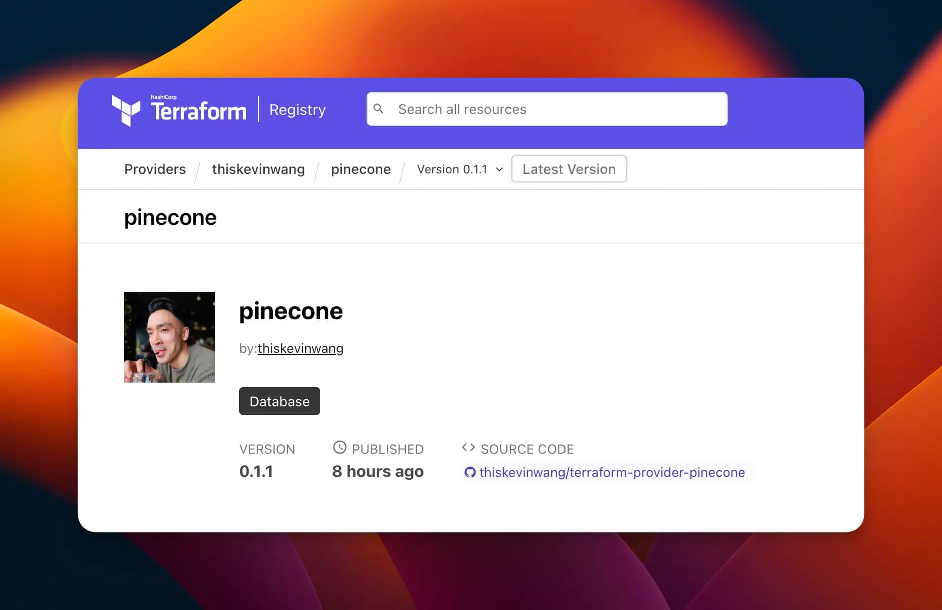 The registry page is at registry.terraform.io/providers/thiskevinwang/pinecone