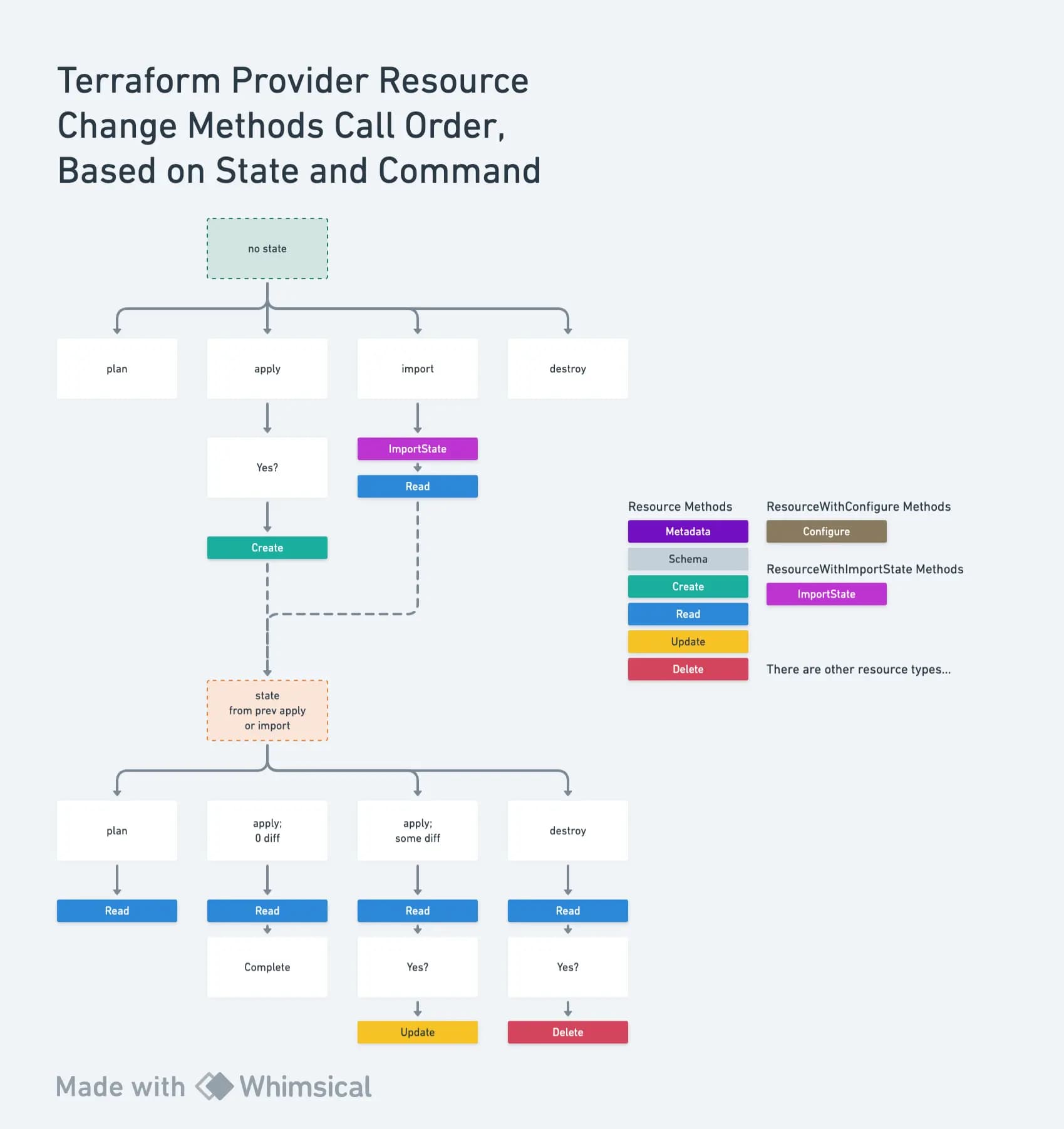I painstakingly ran multiple permutations of plan, apply, import, and destroy with a state and no state, and picking out log statements I added, in order to get a firsthand look at the exact call order of various resource methods.