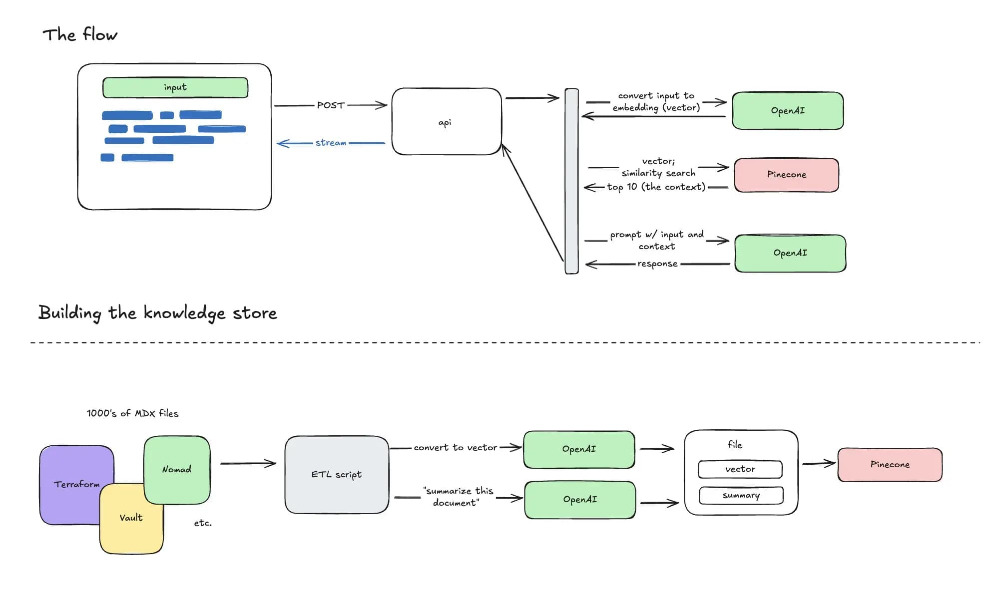 This is a very belated throwback to how I built an AI chat feature for HashiCorp, a company that I used to work at and who I hold dearly to my heart. None of the technical details I will share are sensitive, nor proprietary information. HashiCorp was and is not in the AI space so this is not any meaningful information that would give competitors any sort of advantage.