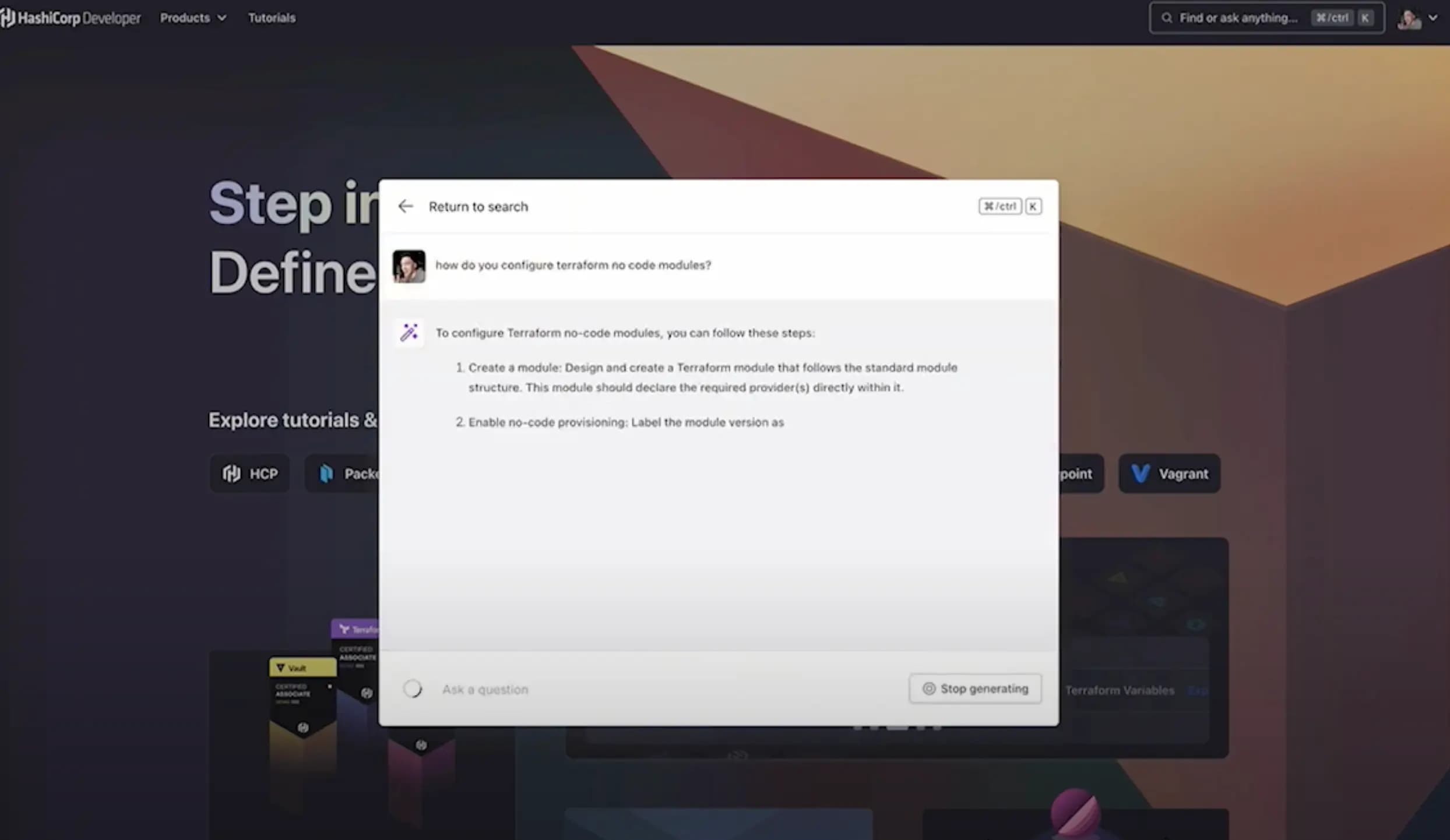ChatGPT was already well established, but its knowledge base was too general for direct usage by an org like HashiCorp to be valuable. It needed to be tailored towards HashiCorp’s domain — Terraform, Vault, Nomad, etc. — in order to have a fighting chance at producing relevant and accurate answers.